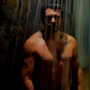 A muscular man standing under a shower, flexing his muscles with a determined expression.