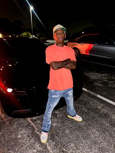 Young male from Saint Louis, MO, posing confidently next to a car at night. He is standing in front of a car with a sporty design, wearing casual streetwear and has a tattoo on his arm. The setting suggests he might be attending or leaving an event, given the context of his attire.