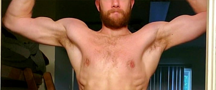 A male model showcasing his well-defined muscles and physique, with a focus on his strong arms and sculpted abs.