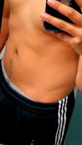 An image showcasing a male fitness model, Killi, demonstrating his physique with a focus on abdominal muscles. The photo seems to be taken in a private setting and captures the subject from the waist up.