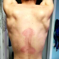 A unique scene featuring a model with a visible bruise, possibly from an intense play session. The backdrop is minimalistic and professional, highlighting the model's physique and the attention-grabbing bruise on their body.