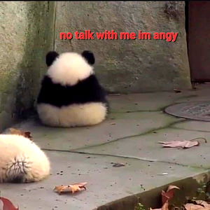The image shows a panda bear sitting alone in an outdoor setting, looking discontented. The text above the image reads: 'No talk with me I'm angry'. The panda is wearing a black and white shirt, which adds a humorous touch to the scene.