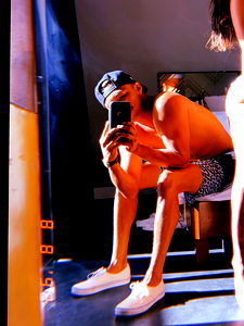 A young man with short hair and a muscular build is seen in an indoor setting. He's wearing white shorts and black shoes while posing for the camera. His shirtless physique and confident posture suggest he might be a fitness enthusiast or model.