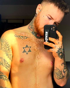 A tattooed man in a casual pose with a phone in hand, capturing his toned physique. He sports tattoos and has a beard, showcasing a style associated with modern masculinity.
