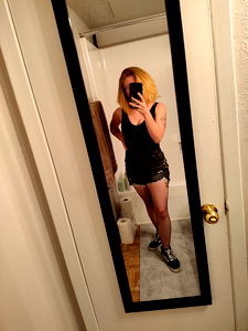 Ash Marie, a stunning model, poses confidently for this photo. She's wearing a chic black outfit and thigh-high stockings. Her pose in front of the mirror captures her unique style and exudes confidence. Don't miss out on her content on OnlyFans!