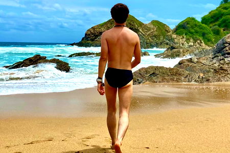 Andrew1111 is seen striding confidently on a sandy beach. The crystal blue water of the ocean is visible in the background, adding to the serene atmosphere.