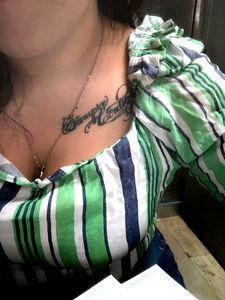 A woman in a green and white striped top displays a tattoo on her shoulder, wearing a necklace. She appears to be seated at a table, possibly in an indoor setting. Her gaze is directed off-camera, suggesting engagement with someone or something out of frame.