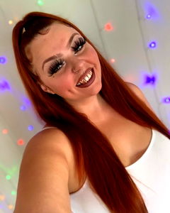 A young woman posing for a photo with vibrant hair, striking makeup, and smiling at the camera. She's wearing a white top.