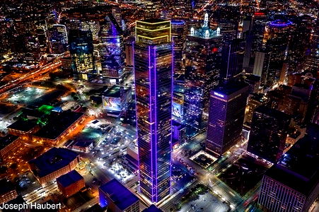 Vivid night scene of a bustling city center, dominated by towering skyscrapers illuminated with colorful lights. The image captures the city's dynamic energy and vibrant architecture, showcasing the urban atmosphere in full bloom.