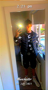 This image depicts a person, presumably an influencer or model from Manchester, England. The individual is holding a smartphone, taking a selfie while standing in front of a mirror. They are dressed casually, wearing shorts, a graphic t-shirt, and sneakers. Their hair is short and styled, and they have tattoos visible on their left arm. This photograph appears to be capturing a moment from their daily life or routine.