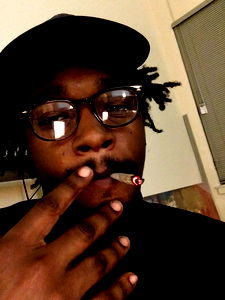 A person smoking a cigarette, wearing glasses and a hat, captured in a candid moment.