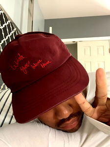 AA, a United States OnlyFans model, is seen in a bedroom setting wearing a red bucket hat with a personal message and peace sign. The cap features the text 'Love Your Life'. AA appears to be taking a selfie.