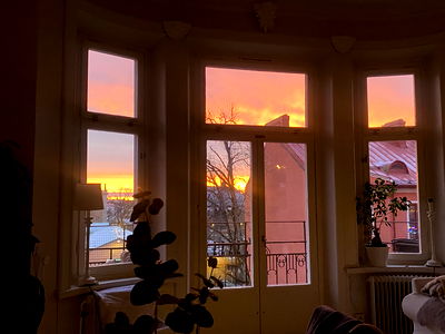 This image captures a serene moment at sunset, with warm light streaming through the windows of a cozy living room. The scene is dominated by hues of orange and yellow, creating a welcoming atmosphere. A window offers a glimpse into the beautiful night sky, where the moon is beginning to rise. A wooden balcony can be seen outside, adding to the charm of the home. 3D rendering art style. Perfect for interior design inspiration or as a calming backdrop for meditation and relaxation.