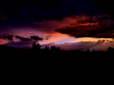A picturesque scene of a sunset with clouds in the sky, captured during dusk. A house can be seen in the background on the right side.