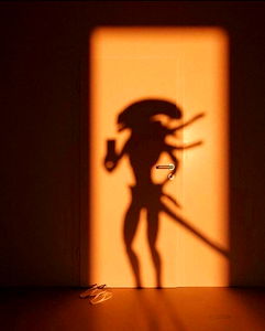 The image features the OnlyFans model Eatmyshorts standing in front of an open door with a silhouette projected on it. The model is holding a drink in their right hand. This is a creative and stylized representation of the model.
