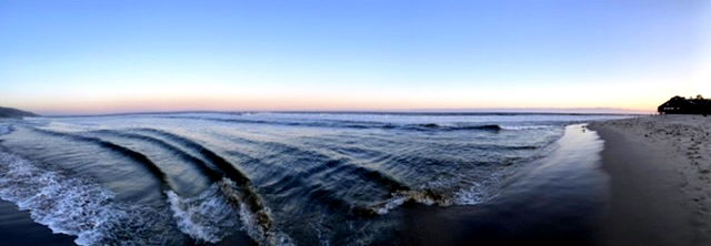 A stunning aerial view of the ocean meeting the sky, with soft sand and waves gently rolling onto shore. The warm golden hues from the sun cast a peaceful ambiance over the scene, creating an idyllic and relaxing atmosphere.