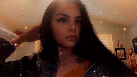 The image shows a woman posing for the camera, with dark hair styled in a straight manner. She has a neutral expression on her face and is wearing what appears to be a casual outfit. The background is out of focus, but it seems like an indoor setting with some sparkling elements.