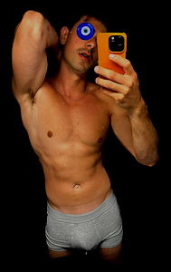 Sam, a fitness model, showcases his toned physique in this black and white photoshoot. His shirtless pose highlights his muscular build, making him stand out as a health-conscious individual. The image is taken indoors, with Sam holding up a phone to the camera, possibly for a selfie or to share his progress on social media.