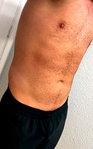 Fitness model showcasing his well-defined physique, emphasizing his midsection. From Phoenix, AZ. Onlyfans model name AAFLYBOY. Image captures an oblique view of the body, highlighting muscular definition and abdominal workouts.