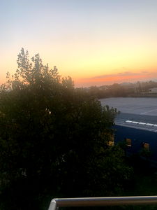 A serene evening view with a sunset, trees and clouds against the sky, taken in Leeds, UK. This photo captures the tranquility of the moment, with the orange glow of the setting sun casting warm light on the surroundings.