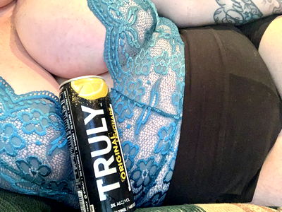 This image captures a moment of indulgence, featuring an OnlyFans model enjoying a refreshing beverage. The vibrant yellow can stands out against the backdrop of a cozy room adorned with personal touches like a blue lace bra and a green lace panties. A bottle of True Citrus soda is held aloft in one hand, while the other cradles a can. The model's OnlyFans handle, Aannunzi727, adds an element of exclusivity to the image.
