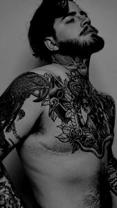 A close-up photo captures the raw and artistic nature of Booktok's trans dad, showcasing his unique tattoos and intense gaze. The image speaks to a narrative beyond the physicality, highlighting the model's journey through a lens that is at once sensitive and empowering. This image serves as a testament to the power of personal expression in photography.