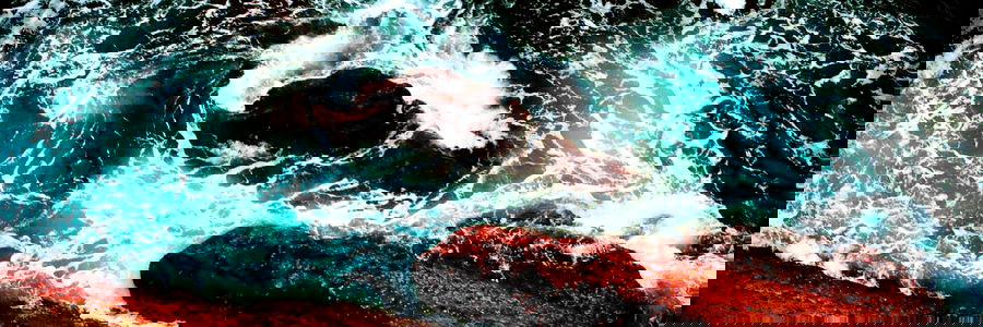 A dramatic ocean scene with crashing waves and a rocky shore. Color palette of blues, whites, and greys captures the raw power of nature.