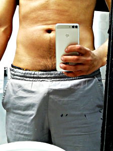 The image features a man in a revealing gym outfit, holding a smartphone to capture a mirror selfie. His toned physique and relaxed pose suggest confidence and self-assurance. He is tagged with terms related to fitness, bodybuilding, and self-care. As an OnlyFans model, he may be promoting his profile or sharing a moment from his personal life.
