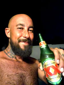 A bearded man with tattoos poses for the camera, showcasing his ripped physique and the tattoo that's visible on his forearm. He appears to be in a poolside setting, adding to the relaxed atmosphere of the photo.