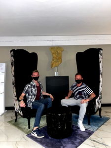 A man named Aaron poses with another individual in a hotel lounge, sitting on chairs. They are engaged in conversation. The setting features an art deco-inspired decor, with black velvet seating. The atmosphere appears casual and relaxed.