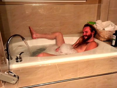 Aarrett Stevenson, a man with a beard and sunglasses, is seen on a hike in the mountains of Lake Tahoe. He's donned in a beige bucket hat and a red backpack, embodying the spirit of outdoor adventure.