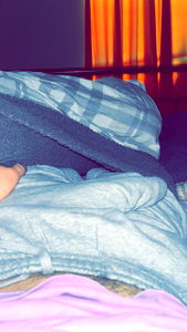 A cozy scene in a bedroom, with the person partially hidden under a blanket. The room has warm lighting that creates a comfortable ambiance.