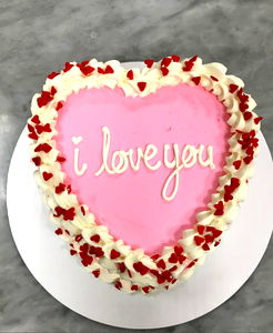 This heart-shaped cake, adorned with a loving message, is the perfect centerpiece for a Valentine's Day celebration. The vanilla cake base is topped with a layer of pink frosting that adds a touch of romance, while the red sprinkles scattered on top add an extra pop of color. This sweet treat is sure to make someone feel special and loved.