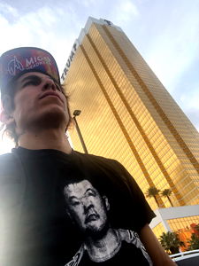 This image features a stylish young man from Guadalajara, standing confidently on the streets. He is dressed in an eye-catching ensemble and sports a vibrant, graphic t-shirt, hinting at his youthful spirit. The backdrop of the photo reveals a luxurious casino building, adding to the urban feel of the scene.