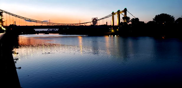A captivating scene of a serene river at sunset, with the silhouette of a bridge in the background. The calm water reflects the light of the setting sun, creating a peaceful ambiance. The Park Rapids area, Minnesota.