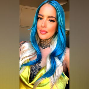 This image features Abbey, a model known for her vibrant blue hair and visible tattoos. She is seen in a stylish outfit that complements her fashion-forward appearance. The model poses confidently, adding to the overall appeal of the photo.