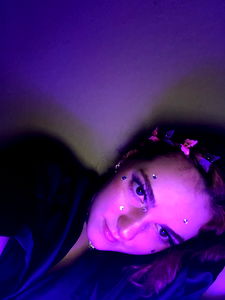 Caught in the glow of the neon lights, Abbey Jayde's eyes sparkle as she poses for this vibrant OnlyFans photo. Her purple hair matches her matching necklace, creating a striking visual effect.