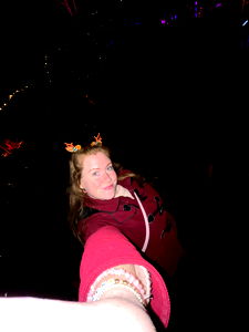 A person taking a selfie in a dark setting, possibly at an event with lights in the background.