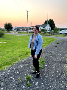 The image features a young woman standing on a gravel path at dusk, with a rural setting behind her. She is wearing casual clothing and appears to be looking towards the camera.