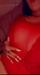 An exclusiveOnlyFans photoshoot featuring the stunning model, La Bonita. In this particular image, she is seen in a vibrant red dress with a playful lick on her finger.