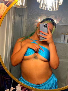 In this image, Abee is proudly displaying her tattoo. She's a popular OnlyFans model with a unique sense of style and confidence in her appearance. The photo captures her looking directly at the camera with a playful expression.