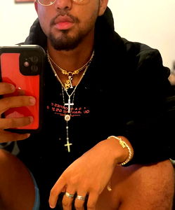 A young man in glasses takes a mirror selfie, capturing his casual style and gold necklace. He's holding a smartphone.