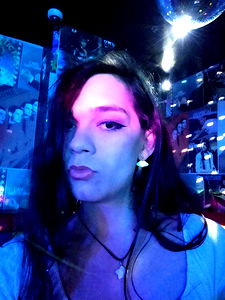 Abigayl is seen posing with her makeup done, appearing confident and stylish. She is standing in front of a disco ball, hinting at a party or event setting. Her outfit suggests she might be going out to enjoy the night. She seems to be enjoying herself, adding to the lively atmosphere.