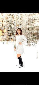 In the image, a woman is captured in a candid moment, smiling at the camera. She has short hair and is wearing a turtleneck sweater. The background is neutral, suggesting an indoor setting with natural light coming from the window. Her makeup is minimal, focusing on her eyeliner, which adds to her relaxed yet stylish look.