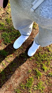The image captures a dynamic scene with a pair of sneakers captured mid-stride on a pathway. The blurred motion suggests speed and movement, evoking a sense of youthful energy.