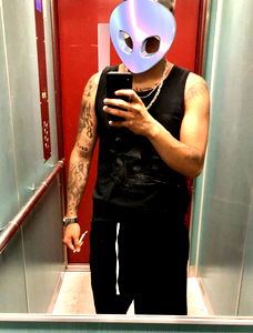 A person posing with a phone, wearing an unusual alien-like mask and a tank top, standing in front of a mirror. They are holding the camera at arm's length.