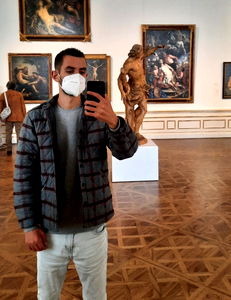 In the image, a young man is seen inside a gallery, standing in front of a display case. He's casually dressed, wearing a plaid jacket and blue jeans. The setting suggests he's visiting an art exhibition, as evidenced by the paintings hanging on the wall behind him. He's taking a photo with his smartphone, capturing this moment at the museum. This scene is quite common today, where people often document their experiences in museums and galleries. The image portrays a blend of modern technology and art appreciation.