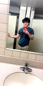 Alex, a young adult male model, captures his selfie with confidence and style in a public restroom. Sharing an everyday moment with a modern twist.