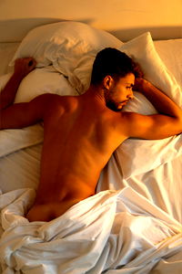 A captivating image of the popular OnlyFans model, Rey Gon, who is captured in a bed shot that highlights his fitness and charm. He's lying on his stomach, showcasing his muscular physique and enticing pose.