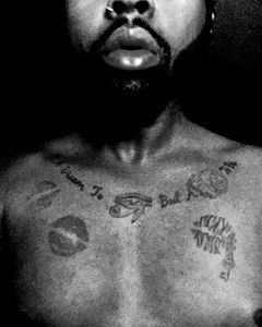 This image features a model with a distinctive style, wearing a unique outfit and accessories. The model has multiple tattoos visible on their arms, which contribute to their overall aesthetic. They are seen in an indoor setting, lying down with their head resting on one hand. The room has a playful vibe with a blue and white teddy bear visible in the background.